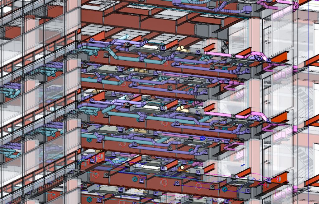 実際に建物を建てる前に、バーチャル空間(コンピューター上)に3次元モデルを建てきる。つまり収集した膨大なデータを元に、限りなく現実に近いシミュレーションがコンピューター上で再現できることから、3次元の施工モデルとして様々な角度から検証することができ、手戻りのない建築を目指すことができる。干渉や衝突の検出が早期の段階で気付くことができるのである。