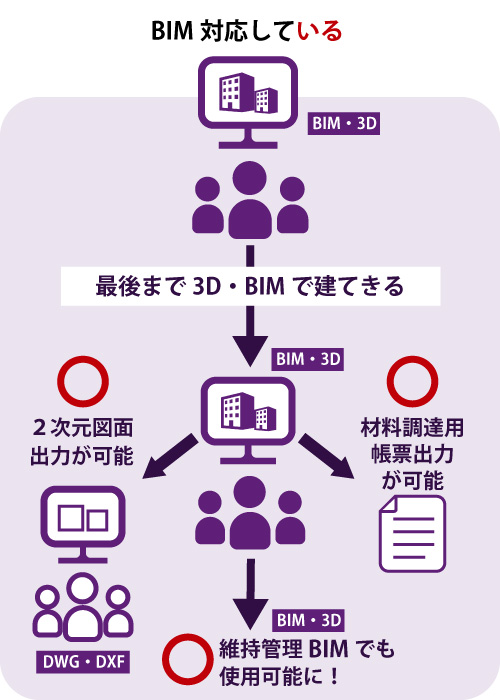 『BIM対応』をすることで、検証や工程、生産、維持管理など全ての情報を活用できる。「建物を建てる前に情報を見える化して、手戻りの無い工程で建築を目指しましょう」ということ。