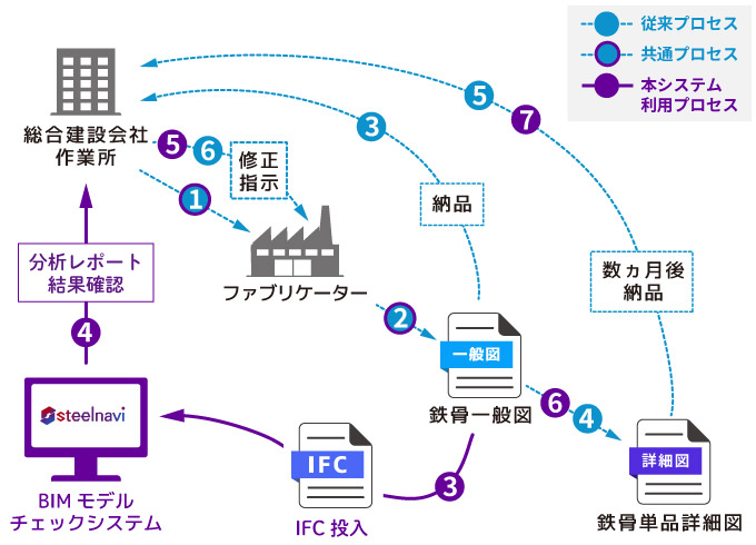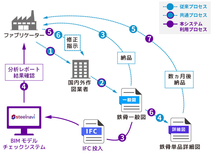 steelnaviの『BIMモデルチェックシステム』は、主要なすべてのBIMソフトで作成されたBIMモデルから、鉄骨ファブリケーターでの加工性や構造要件への整合性を「効率的」にチェックするシステムです。